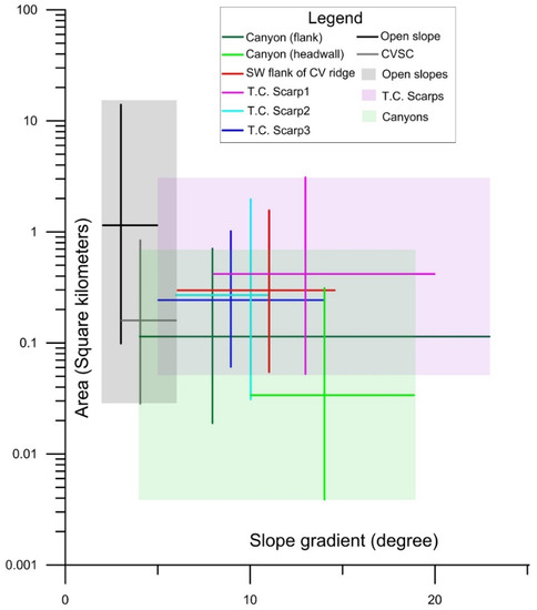 This type of slope failure mostly occurs along canyons, accounting for more than half of the total observations (59%), even if they are generally of small– and medium–size, contributing only to the 5.2% of the mobilized sediment volume [15]. Another main cluster of small– and medium–size, disintegrative–like landslide scars is observed along the tectonically–controlled scarps affecting the area. The overall small size of these failures can be mostly related to the steep slope gradients (values ranging from 10° to 23°, Table 1 and Figure 6) occurring in canyons and tectonically–controlled escarpments coupled with the frequent seismicity that characterizes the study area.