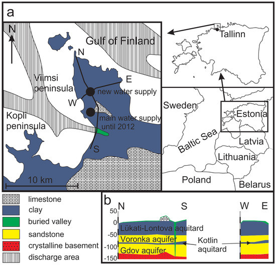The Viimsi peninsula is in northern Estonia, next to the republic’s capital, Tallinn (Figure 1a). The surface area of the peninsula is about 50 km2. The landscape is flat, covered with glacial and marine deposits from the Quaternary Period. Except for the southern part of the peninsula that is underlain by Ordovician carbonate rocks, Quaternary deposits lie directly on Lower Cambrian clays and clay stones (the Lükati-Lontova regional aquitard) with a thickness of ~40 m (Figure 1b). This formation confines the underlying Cm-V aquifer system, which is the only major aquifer system in the study area. The Cm-V aquifer system contains groundwater with low TDS that has the most depleted isotopic composition recorded in Europe (δ18O values from −18.5‰ to −23%), whereas the δ18O values of the modern groundwater range from −11 to −12.5‰ [18,19,20].