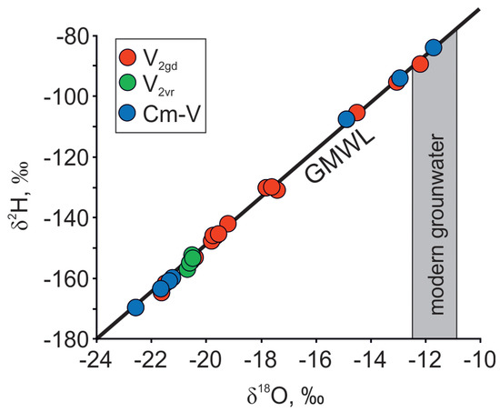 The data for the isotopic, major cation and anion compositions of the sampled groundwater in the Cm-V aquifer system in the Viimsi peninsula are given in Table 1. The δ18O and δ2H values of groundwater vary from −11.7 to −22.8‰ and from −84 to −170‰, respectively, and plot close to the Global Meteoric Water Line (GMWL) (Figure 2). Chemical and isotopic composition varies both laterally and with depth. The δ18O values and Cl− concentrations of the lower Gdov aquifer are from −12 to −22.5 and 10 to 730 mg·L−1, respectively. The isotopic composition of groundwater is more uniform in the upper Voronka aquifer (δ18O ≈ −20.5‰) and Cl− content there is no higher than 80 mg·L−1.