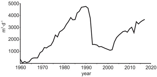 Groundwater abstraction on the Viimsi peninsula started in the early 1960s and groundwater consumption increased constantly until the beginning of 1990s. By 1991, the piezometric heads in the Cm-V aquifer system had decreased to −7 to −8 m b.s.l. and in the southern part of the peninsula occasionally even to −16 m b.s.l. Since 1994, when groundwater consumption started to decrease, and the hydraulic heads slowly recovered. This process proceeded more swiftly in the deeper-lying Gdov aquifer [43]. During the period after 1994, the groundwater was pumped from the wells which were scattered mainly over the south-western part of the peninsula. In 2012, a new water-supply station was opened, and the groundwater consumption was concentrated to 11 wells in the central part of the peninsula (Figure 1).