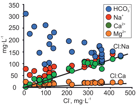 In 1987 to 1992, a significant increase in HCO3− and SO42− concentrations is observed together with enrichment in isotopic composition (Table 1; Figure 4a). However, in recent years (from 2013 to 2016), changes in isotopic composition are mainly accompanied by increased concentration of Cl− (Table 1; Figure 4b,d,f). The increase in Cl− concentrations is accompanied by an increase in Na+ and Ca2+ concentrations and the decrease in HCO3− concentrations (Figure 5).