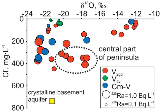 Co-variance between δ18O and Cl− relation with 226Ra variations in Cm-V groundwaters of the Viimsi peninsula.