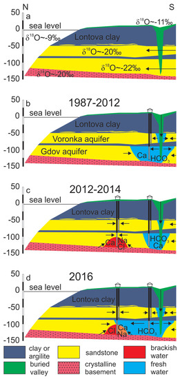It can be proposed that the three-component mixing observed in the Gdov aquifer has occurred in two stages. In natural conditions, the piezometric levels of the Cm-V aquifer system in the Viimsi area were above seawater level [51] and the aquifer contained glacial palaeogroundwater (Figure 7a). The groundwater abstraction that started in the 1960s (Figure 3) lowered the hydraulic head by several metres, the strongest impact occurring first (in 1960 to 1992) close to the buried valley, where infiltration of modern meteoric water had become the main compensation mechanism for the lowered hydraulic heads (Figure 7b). The influx of groundwater containing O2 and having higher CO2 partial pressure resulted in atypically high HCO3−, SO42− and NO3− concentrations in the Cm-V groundwater in the period from 1987 to 1991 (Table 1). In 2012, the new groundwater intake started to operate in the central part of the peninsula and the main groundwater abstraction shifted to this area (Figure 7c). The buried valley lay too far for the abstraction to be directly compensated by infiltration of modern groundwater. Thus, the upwelling of saline groundwater from the underlying crystalline basement became the dominating hydraulic head compensation mechanism, which was accompanied by an abrupt rise in Cl− and Ca2+ concentrations in groundwater. The deterioration of groundwater quality in the newly founded intake led to reopening of wells in the southern part of the peninsula. This new situation has decreased the inflow from the underlying crystalline basement aquifer and has supported the flow of modern groundwater from the buried valley to the more central parts of the peninsula (Figure 7d). Chemical and isotopic compositions of groundwater suggest that at present, the front of modern groundwater has almost reached the new groundwater intake and the wells receive groundwater from both the crystalline basement and the buried valley. As a result, Cl− concentrations have stabilised or even decreased a little and the water’s stable oxygen isotope composition has become enriched with respect to glacial palaeogroundwater which occupied the aquifer system in natural conditions. According to this reasoning, the mixing of three different water types (glacial palaeogroundwater, brackish/saline groundwater from the crystalline basement aquifer and fresh modern groundwater from the buried valley) induced by groundwater abstraction explains the changes in groundwater quality and isotopic composition observed on the Viimsi peninsula (Figure 7d).