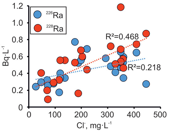 One of the important issues that has occurred with increased abstraction and subsequent changes in the chemical composition of the groundwater in the Gdov aquifer is the rise in radium activity [24]. Activities of 226Ra and 228Ra in the Gdov aquifer of the Viimsi peninsula vary from 0.1 to 2.14 Bq·L−1 and from 0.1 to 1.12 Bq·L−1, respectively. The rise in Clˉ concentrations on the peninsula are caused by the inflow of water from the crystalline basement, as shown in the previous section. This water is brackish or saline, and typically has a higher content of radionuclides [25], because of U and Th present in the crystalline basement [52,53]. The gamma radiation well-logs also support this understanding (Appendix A). Our results show the covariance between Cl− and Ra, although the correlation with Cl− is better for 228Ra than for 226Ra (Figure 8). This observation indicates that the source of Clˉ must lie close to the sampling wells, due to relatively short half-life of 228Ra (5.75 years). By contrast, 226Ra (half-life is 1,600 years) has a wider spread from the mixing line of Ra and Cl−. This could indicate that the 226Ra origins from several sources or it has been affected by substantial geochemical changes, due to its longer residence time in groundwater.