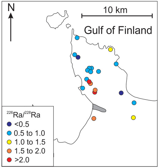Although higher Ra activities observed in the Cm-V aquifer system have been attributed to the prolonged contact with the rocks of the crystalline basement [26,43], Ra is also present in the Voronka aquifer (226Ra from values under the detection limit to 0.4 Bq·L−1; 228R from 0.1 to 0.3 Bq·L−1), which has no direct contact with the crystalline basement. Concentrations of Cl− and δ18O values in the Gdov aquifer have a clear mixing trend with modern groundwater, but the 226Ra values in groundwater having modern isotopic signature stay moderately high (Figure 6) and 226Ra activity percentage in total radium activity increases towards the buried valley (Figure 9). This may indicate heterogeneous spreading of U in surfaces of sedimentary rocks, in which case locally high U contents could occur resulting in higher Ra activities [59].