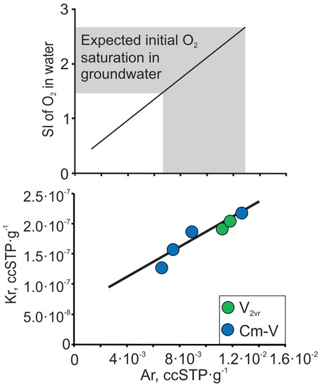 Anoxic conditions predominate in the Cm-V aquifer system, but Raidla et al. [21,48] show that oxygen-rich conditions dominated in the aquifer system in the relatively short infiltration period during the advance and maximum extent of the Scandinavian ice sheet in the Last Glacial Maximum. Vaikmäe et al. [20] have shown that groundwater in the Cm-V aquifer system in North-Estonia is characterised by enormous amounts of excess air (oversaturation of Ne up to 200–400%). The anomalous amount of excess air in groundwater has been thought to originate from air bubbles found in glacial basal ice [20]. Alternatively, Kipfer et al. [66] and Grundl et al. [67] have explained that the high Ne excess air amounts observed in groundwater of glacial origin are derived from trapped air pockets in englacial drainage systems, which behave in the same manner as trapped bubbles in porous sediments. The relation between Ar and Kr in Cm-V groundwater from the Viimsi peninsula follows the trend expected for the addition of air to air-equilibrated water (Figure 10; Table 3). These results agree with both hypotheses, because noble gas composition in ice generally corresponds to atmospheric composition, except for He and Ne, which can diffuse out of the firn during the firnification process, due to its smaller atomic radius [68]. As the concentrations of noble gases, such as Ar and Kr in subglacial meltwater correspond to atmospheric composition, we propose that a similar relationship can also be applied for other atmospheric gases, like O2. For instance, by knowing the concentration of Ar in groundwater, one can also calculate the initial oxygen concentration in glacial meltwater. Figure 10 indicates that the glacial meltwater, which intruded the aquifer system in the Pleistocene, was 1.5 to 2.5 times oversaturated with respect to O2.