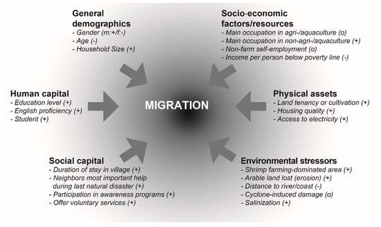Our independent variables (IVs) were selected on the basis of the above discussion of past research (Figure 1). They include indicators for (1) individual and household demographics, (2) human capital, (3) social capital, (4) other socio-economic resources, (5) physical assets, and (6) environmental stressors. More specifically, the latter include five indicators covering three of the most frequently addressed environmental stressors in the literature (Section 2 above, [31]): First, two controls for the household’s “exposure” i.e., natural hazard likelihood: (1) Saltwater shrimp farming upazila (indicator for above-average soil and water salinity) and (2) Distance of household to the next major river or coastline (indicator for exposure to flooding hazards; calculated from GPS location information). Second, we included direct event reports from the survey which control for severe flooding, cyclone activity and salinization: (3) Reported arable land loss (indicator for erosion); (4) Reported household expenditures related to cyclone damage and (5) Reported problems with freshwater availability due to salinization. These indicators allow us to identify whether individuals living in households that are exposed to or affected by any of these hazards are more likely to migrate.