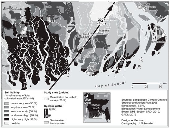 - Chen, J.; Mueller, V. Coastal Climate Change, Soil Salinity and Human Migration in Bangladesh. Nat. Clim. Chang. 2018, 8, 981–985. [Google Scholar] [CrossRef]