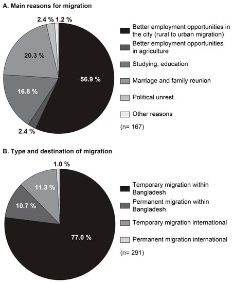 How do these dynamics affect migration behavior? As Fussell et al. [1] argue in their literature review, environment–migration research needs to integrate multiple environmental stressors along with other determinants of migration and recognize that there are costs and migration obstacles that “trap” populations. Environmental stressors can be both reasons for and obstacles to migration [51]. Some studies have looked at the rural immigrants who have settled in the urban slums, i.e., receiving community studies. Istahique and Ullah [33] find that both “push” (i.e., economic hardship, family problems, natural disasters, threats of violence) and “pull” factors (e.g., perceived economic opportunities, positive views of city living) influenced the decisions to migrate and that about 10 percent of these migrations were due to natural disasters, typically leading to destruction of farmland and housing by severe river erosion or cyclones. These disaster migrants represent only a small share of all rural-urban migrants, but they are an extremely vulnerable segment, reporting major disruptions in their household income and loss of their household assets. They also find support for the “environmental capital” thesis [2] that farm households with greater land access are more likely to have one or more members migrate.