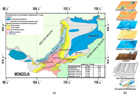(a) Map of the distribution of permafrost types [17] and the scheme of the atmosphere and soil measurement complex (ASMC) locations; (b) an example of a cartographic method of investigation.