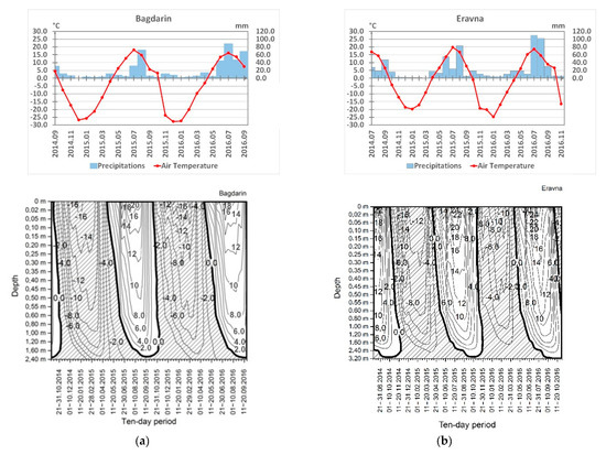 Temperature and permafrost regime: (a) Turbic Cryosols (Humic) (Bagdarin polygon); (b) Luvic Chernozems (Stagnic, Tonguic) (Eravna polygon).