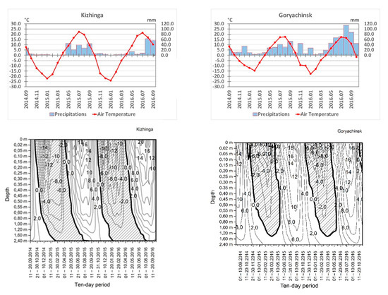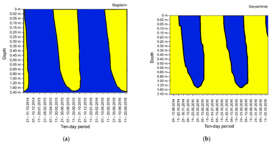 A completely different temperature regime was observed in the nonpermafrost Natric Chernozems (Stagnic) in the Kizhinginskaya depression and the Entic Podzols of the Eastern Pribaikalye in comparison to the permafrost soils of the Vitim Plateau. These soils seasonally froze only in winter to a depth of more than 2.40–2.45 m and 1.60–1.65 m, respectively. The thawing process began on the soils at the Kizhinga polygon in early April, which was 10, 15, and 20 days earlier than on the soils of the Goryachinsk, Eravna, and Bagdarin polygons, respectively (Figure 3).