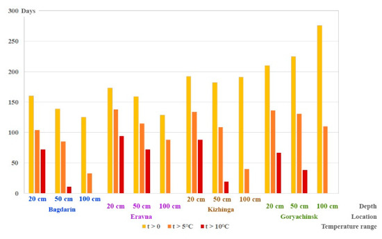 The greatest differences were found in the duration of temperatures >0 °С at a depth of 1.00 m: 275 days in the Entic Podzols, and 190, 130, and 125 days in Kizhinga, Eravna, and Bagdarin, respectively. The number of days with temperatures above 10 °C at a depth of 0.20 m was 94 for Eravna, which was 27, 22, and 6 days longer than in Goryachinsk, Bagdarin, and Kizhinga, respectively.