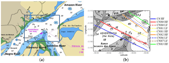 Nautical chart (source: Brazilian Navy [1]) showing the confluence of the Negro and Solimões rivers. The area within the blue square in (a) is enlarged in (b), where the locations of the transects of a collection of data by the CLIM-Amazon Project are shown. The numbers indicate the depth in meters of the level above which the rivers remain for approximately 90% of the time.