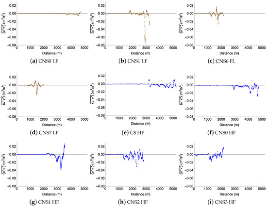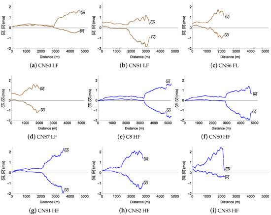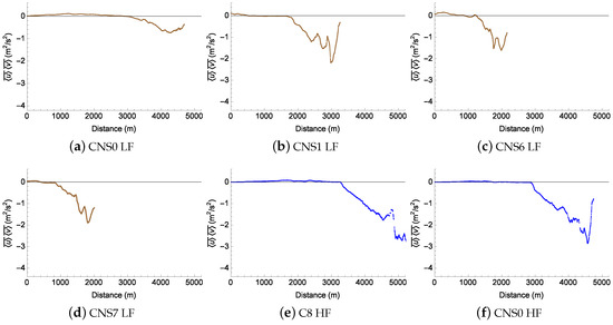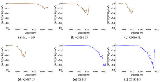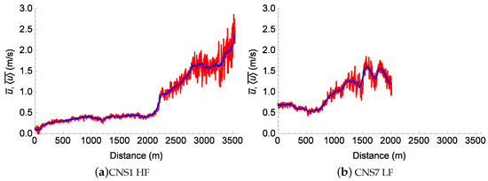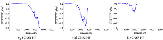 Figure 2 depicts the velocities and for the transects CNS1 HF and CNS7 LF. Figure 2 illustrates the procedures that were adopted in this study. The quantities in angled brackets in Figure 2 and thereafter were calculated by averaging over a 100 m length, thus formally distinct from a slowly varying average but yielding similar quantitative results. A distance of 100 m was chosen to include few turbulent structures. The regularity of fluctuations along the distance indicates structured turbulence patterns. The origin of the distance on the horizontal axes of the plots in this paper corresponds to the data collection point in each transect located closest to the Negro side of the Amazon channel.