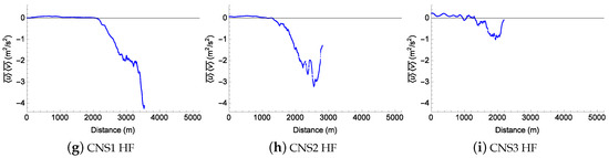 The lateral gradient of the velocity magnitude extends to the downstream end of the CHZ (Figure 4d,i). However, the sharp lateral gradient of the values of along the center of the mixing interface diffuses along the downstream direction (sequences in Figure 4a–i), and a consistent downstream increase in the magnitude of on the Negro side is observed. Figure 4i shows a particular reduction in the absolute value of on the Solimões side, which indicates realignment of the flow after overcoming the sharp bend on the Solimões side.