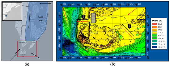 (a) The location of the Eastern Shore Project site outlined in red, along with the south bay shown in blue and important flow patterns indicated by arrows; and (b) The bathymetric map of the Eastern Shore Project site, as well as the location of the marsh of interest (shown in Gray), the significant flow patterns (flood in black arrows, ebb in red arrows), and the two main inlets which are numbered. The grid cells of the bathymetric figure have a 1-km resolution.