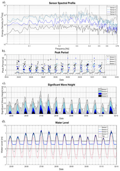 (a) Spectral Profile, determined for the hour of 23:00 26 September 2015; (b) the Tp; (c) the Hs; and (d) the water level, for the 4 Trublue sensors across the marsh. The readings from figures (b) to (d) are taken from 25 September to 2 October 2015.