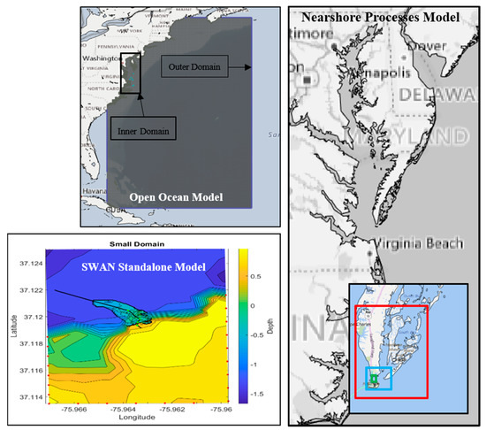 In order to run the SWAN standalone model (SSAM) for the study area, boundary conditions needed to be determined. This was done through the creation of a Delft 3D Flow + Wave model that recreates the necessary offshore and nearshore wave conditions. This Methodology section is therefore broken down into three parts, each describing the models mentioned above. These parts include: (i) the largest (2120 km by 2483 km) Open Ocean model (OOM), whose purpose is to recreate offshore wave climate and storm surge due to meteorological forcing; (ii) the Nearshore Processes Model (NPM), which refines portions of the OOM to recreate the nearshore processes necessary to produce boundary conditions; and (iii) the SWAN Standalone model (SSAM), which uses the boundary conditions produced by the NPM to assess the vegetation representations.
