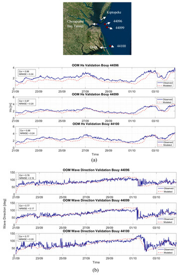 The NOAA buoy and tide station data used to validate the OOM is shown in Figure 5 and Figure 6 along with their corresponding correlation coefficient and normalized root mean squared error. Figure 5a,b show the comparison of the Hs and Wave direction. The model recreates the Hs with the largest correlation of 0.88 occurring at buoys 44096 and 44099 and the smallest NRMSE of 0.20 occurring at buoy 44099. The highest correlation of 0.77 for wave direction is achieved at buoys 44099 and 44100 with buoy 44096 achieving the lowest NRMSE of 0.16. Figure 6a,b show the comparison between the peak period and the water level. The model recreates the observed peak period with the highest correlation of 0.77 occurring at buoys 44099 and 44100 and the lowest NRMSE of 0.17 occurring at buoy 44099. The model water levels in Figure 6b achieve a correlation of 0.86 and NRMSE of 0.41 with the observed buoy data.