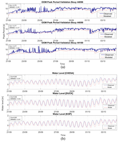 Comparison between the observed (blue) and model (red) results. The legend on the left indicates correlation coefficient (Cor) and normalized root mean square error (NRMSE): (a) Comparison between the peak periods (Tp); and (b) Comparison between the water levels.