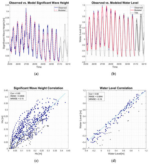Significant wave height (Hs) and water level validation for the NPM against Sensor 1 (the only gauge in a non-vegetated area): (a,b) show the data comparison; while (c,d) show the correlation between the observed and modeled data. The gray portions of the data show regions of inaccuracy that were not addressed.