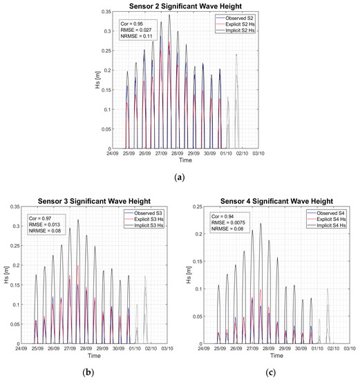 Comparison between the Hs at each sensor, for both Implicit and Explicit representations. The legend in the top right shows the correlation coefficient (Cor) and normalized root mean square error of each sensor (NRMSE). Panels (a–c) show the results for Sensor 2, 3 and 4, respectively.