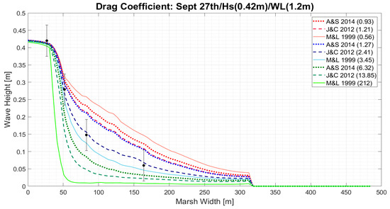 The highest water levels and wave heights were recorded at the marsh on 27 September of 2015, and therefore, our analyses will focus on this period. The three current velocities used to determine the drag coefficients are indicated in Figure 9 and are 0.1 m/s (red), 0.29 m/s (blue) and 0.7 m/s (green). The most accurate results were created using the Jadhav and Chen 2012 [37] drag formulation with the average current velocities indicated by the dashed dark blue line in Figure 9. In general, the Hs is reduced by approximately 40% at 50 m into marsh and 80% at 160 m into marsh. Looking at Figure 9, the lower drag forces representing the higher current velocities shown in red perform the best at the front edge of the marsh while the lowest velocities perform the best at the back end of the marsh.