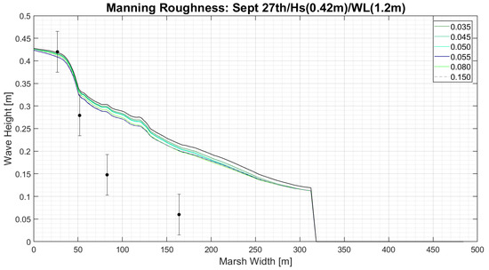Wave dissipation profiles for varied Manning roughness coefficients (implicit representation). The magnitudes of the Manning roughness coefficients are color coded, with their results indicated.