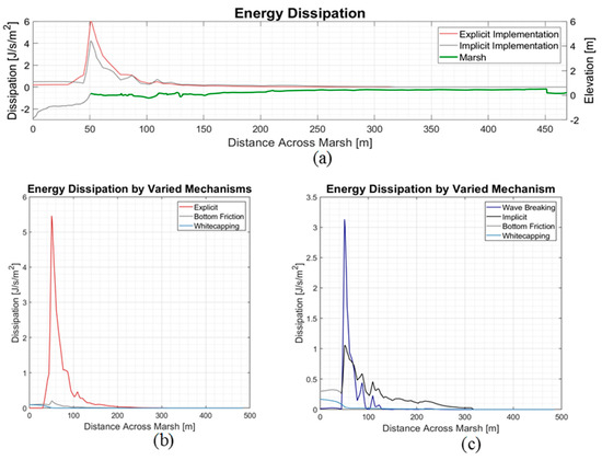 Figure 11 shows the energy dissipation rates across the marsh for both the implicit (gray) and explicit (red) vegetation representations. Both profiles show a region of significant dissipation occurring at the leading edge of the marsh; around 50 m into Figure 11a. The Implicit representation produced a dissipation of 4.2 J/s/m2 while the Explicit representation produced a dissipation of 5.8 J/s/m2. This occurred in the breaker area where a large fraction of the energy dissipation is taking place. Figure 11b,c separated the energy dissipation process into their associated dissipation mechanisms. Figure 11b shows the explicit run which experienced dissipation by whitecapping, bottom friction and explicit vegetation dissipation. Figure 11b shows that the Implicit run experienced dissipation by bottom friction, the implicit vegetation, whitecapping and other forms of wave breaking.