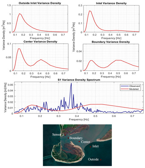 The underestimation of water level and significant wave height, observed in the OOM, was minimal in the NPM (Figure 7). However, the NPM model showed difficulty in recreating the observed spectral profile (Figure 12). As shown in Figure 12, the numerical model transfers an excessive amount of energy to higher frequencies while neglecting energy transfer to lower frequencies, as the water depth becomes shallower. This is seen from the Inlet shoreward, where the modeled spectra show a peak forming at ~0.4 Hz (at the center) which migrates to 0.5 Hz (at the Boundary). This results in an overestimation of wave energy at higher frequencies compared to the observed data at Sensor 1 (Figure 12).