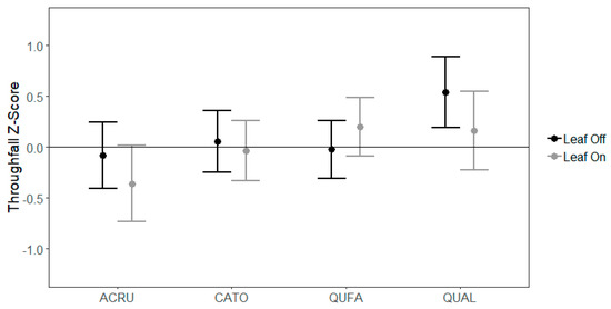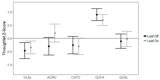 In the midstory, TFz was not different among species (p = 0.233) and was only marginally different due to canopy leaf phase (p = 0.077), with clear differences exhibited as an interaction between species and leaf phase (p = 0.052). In the leaf-off canopy phase, TFz was lower (−0.225) compared to the leaf-on canopy phase (−0.078). Red maple was the only species to exhibit a difference in throughfall partitioning between canopy phases, with much lower throughfall in the leaf-off canopy phase compared to the leaf-on (−0.303 vs. 0.202, p = 0.039) (Figure 2).
