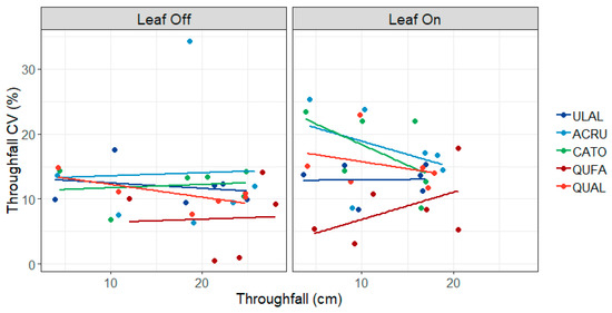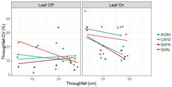 In the midstory, red maple and hickory had the greatest CV (15.8 and 14.6, respectively), followed by white oak (13.0), winged elm (12.4), and southern red oak (7.8). Similar to the overstory, CV was greater in the leaf-on canopy phase (14.3) compared to the leaf-off canopy phase (11.3). In the leaf-off canopy phase, there was essentially no relationship between throughfall quantity and throughfall CV (r2 = 0.00, p = 0.717) (Figure 4). In the leaf-on canopy phase, all species exhibited a decrease in CV with increasing throughfall quantity (r2 = 0.28, p = 0.060, y = −0.04x + 4.67). Interestingly, the CV of southern red oak increased with increasing throughfall, leading to a predictive model significantly different than the other species (p = 0.012).