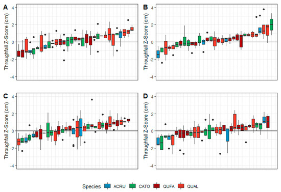Rank of overstory throughfall gauges by species and median z-score in the (A) leaf-off canopy phase next to the tree bole, (B) leaf-off canopy phase at the mid-canopy point, (C) leaf-on canopy phase next to the tree bole, and (D) leaf-on canopy phase at the mid-canopy point. Species codes: ACRU = red maple, CATO = mockernut hickory, QUFA = southern red oak, QUAL = white oak.