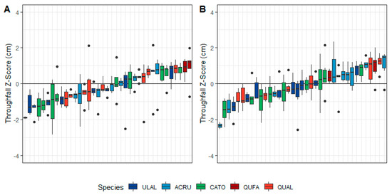 In the midstory, southern red oak throughfall gauges had the highest z-scores in the leaf-off canopy phase but not in the leaf-on canopy phase (Figure 6). In the leaf-off canopy phase, winged elm and hickory dominated the number of gauges with low z-scores (Figure 6A). In the leaf-on canopy phase, seven out of 10 red maple gauges had higher than average z-scores (Figure 6B).