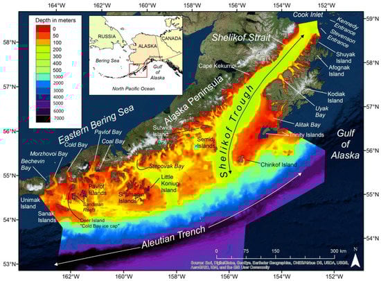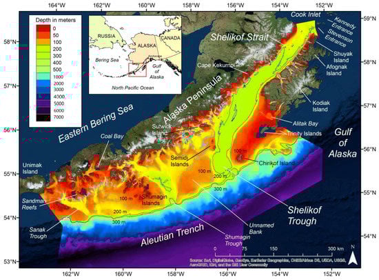 - Zimmermann, M.; Prescott, M.M. Smooth Sheet Bathymetry of the Central Gulf of Alaska; U.S. Department Commerce: Washington, DC, USA, 2015.