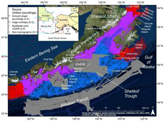 The WGOA and Shelikof Strait provide important habitat for fish, birds, and marine mammals. An improved bathymetry map of the area will provide better descriptions of their habitat requirements. The largest Gulf of Alaska stock of walleye pollock (Gadus chalcogrammus) spawns in Shelikof Strait [], and a new bathymetric map of the area may allow for better modeling of the oceanographic processes [,] that influence recruitment success. Smaller pollock stocks spawn in other areas of the WGOA, including Stepovak Bay and around the Shumagin Islands, Morzhovoi Bay and nearby Sanak Trough, and Pavlof Bay []. The National Marine Fisheries Service (NMFS) sablefish (Anoplopoma fimbria) longline survey [] and the NMFS Gulf of Alaska bottom trawl survey have also indicated the unique importance of Shelikof Strait habitat to the documented population of sleeper sharks (Somniosus pacificus) seen there during surveys. We anticipate that our new WGOA bathymetry compilation will be useful for describing fish habitat because our previous bathymetry compilations were successfully utilized for modeled [] essential fish habitat (EFH) descriptions for the Gulf of Alaska [], the Aleutian Islands [], and the eastern Bering Sea []. Digitizing smooth sheet shorelines and combining them with the smooth sheet soundings allowed shore-to-shore bathymetric descriptions of small study sites in the central Gulf of Alaska [], the eastern Gulf of Alaska [], and verification of smooth sheet data quality [] for the Gulf of Alaska Integrated Ecosystem Research Project (GOA-IERP: https://www.nprb.org/gulf-of-alaska-project/about-the-project/). The GOA-IERP also produced maps of juvenile fish habitat [], capelin (Mallotus villosus) habitat [], and bathymetric steering of water currents in canyons [] by using our improved CGOA bathymetry []. Detailed analysis of historical and recent smooth sheets from the Chignik area of the WGOA demonstrated significant inshore shallowing of some bays over a 70-year period, possibly due to redeposition of volcanic ash in eelgrass (Zostera marina) beds []. Coral and sponge habitats were also modeled using our improved bathymetry for the Aleutian Islands [] and Gulf of Alaska [].