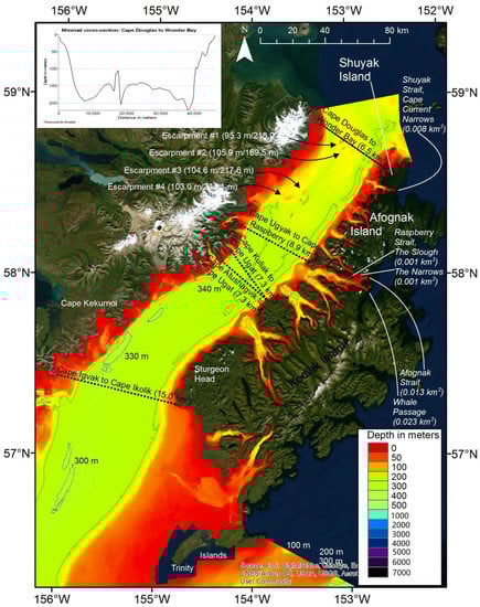Cross-sections show the widest and narrowest areal openings of Shelikof Strait in the western Gulf of Alaska. Four prominent escarpments in the northwest section of Shelikof Strait are indicated along with their minimal and maximal depths. A graph shows the minimal cross-sectional opening of Shelikof Strait, ranging from Cape Douglas on the Alaska Peninsula to a location near Wonder Bay in the Kodiak archipelago.
