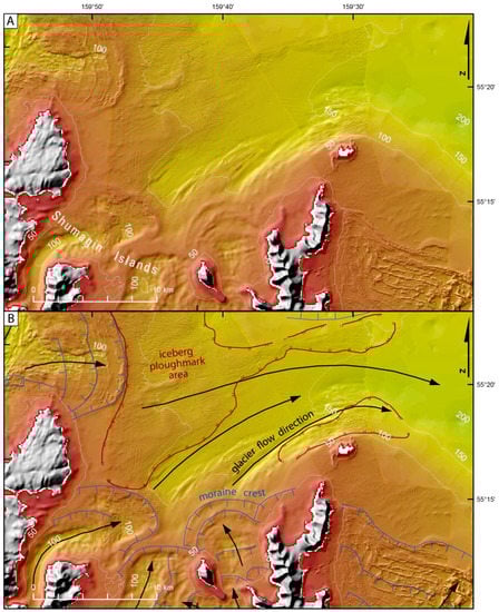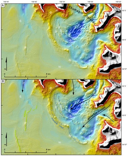 The different extents of moraines leads us to consider their ages. As previously stated, our focus of this paper is descriptive, and not interpretive. The terrestrial moraines mapped on the north side of the Alaska Peninsula [,,,] can be divided into two categories—those older than the limit of radiocarbon dating (roughly 40,000 years) and those younger. The younger moraines terminate mostly on land, whereas the older ones at least partially terminate offshore on the peninsula. There seems to be no simple pattern to relate these dated moraines to the submarine features. The simplest interpretation is that most of the submarine glacial features are related to LGM glaciation, where glaciers were at their maximum positions from around 26,000 to 20,000 or 19,000 years ago []. If Kaufman et al.’s [] assumption is correct that LGM glaciers went to the shelf-slope break, then morphologic evidence of older glaciations was likely completely erased from the region. Another possibility is that LGM glaciers did not make it that far seaward, and that the largest glaciers were limited to the cross-shelf troughs. Work on Sanak Island (Figure 1) indicates retreat of ice from the island just prior to 17,000 years ago [], suggesting rapid retreat of ice from the Sanak trough between ~20,000 and 17,000 years ago. The distinct and well-defined moraines surrounding the Semidi and Shumagin Islands may reflect re-expansion of ice sheets at the beginning of Younger Dryas time as documented elsewhere in southern Alaska [,,]. Additional multibeam bathymetry, high-resolution seismic data, and cores would help to clarify all these questions related to the ages of moraines, deglaciation, GIA and sea level rise. Lastly, given the abundance of sea-floor features from LGM time, such as the iceberg ploughmarks, we infer Holocene sedimentation rates on parts of this margin are low, and thus it seems future coring efforts would be fruitful in clarifying the glacial history of the region.