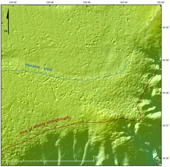 For glacial features, we mapped five types of features: moraine crests, medial moraines, glacier flow directions, eskers, and iceberg ploughmarks (Figure 5, Figure 9, Figure 10, Figure 11, Figure 12 and Figure 13). For typical terrestrial mapping of moraines, the distal position of moraines are mapped, because the entire moraine complex and outwash fans can often be observed. For submarine moraines imaged with the multibeam bathymetry (e.g., similar to moraines in studies in Dowdeswell et al. [] (2016), and Otteson and Dowdeswell [], 2006), we could map similar distal positions of moraines, but the resolution of the single-beam bathymetry is not sufficient to map the distal position of moraines. However, moraine crests can be confidently identified, and thus we mapped moraine crests, not the distal extent of the moraines, throughout the datasets. We did not attempt to map every moraine crest. In particular in the Semidi-Shumagin Island region where there are numerous recessional moraines (Figure 5, Figure 10 and Figure 11), and given the reconnaissance nature of the mapping for this study, we only mapped enough moraine crests to give the reader a sense of their geometries. We encourage further examination of the original NOS multibeam datasets. Also mapped were a few medial moraines. The largest are up to 30 m tall along the west side of Shelikof Strait (Figure 12), which are clearly imaged even with the low-resolution data. Glacier flow directions could also be identified in several ways. In some areas, glacier flow sculpted drumlinoid features and elongate glacial lineations.