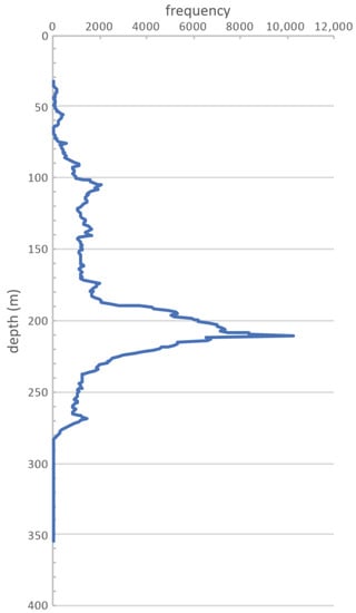 Lastly, iceberg ploughmarks—grooves formed by scraping of icebergs along the ocean bottom [,]—are present in 13 different areas within the study area (Figure 5, Figure 9, Figure 11 and Figure 13). These grooves are commonly less than 1–1.5 m in depth, but a few are 4–7 m deep. One mark was 5.5 km long, and other noticeably long ploughmarks were 3–3.5 km long. The prominent ploughmarks are commonly 70–95 m wide and 115 m was the maximum measured width. Ploughmarks are found on both sides, and on the crest, of the moraine near the west end of Kupreanof Strait (Figure 9), indicating a tidewater glacier during moraine formation and deglaciation. Just north of the Shumagin Islands (Figure 11), the iceberg ploughmarks extend up to the moraine crest, also indicating that there was a tidewater glacier there. At the mouth of Shelikof Strait, both ploughmarks and iceberg pits are found, indicating stagnating ice (Figure 13). Iceberg pits form when melting icebergs turn over and impact the sea bottom, forming circular or semi-circular depressions (e.g., []). These pits often have lips adjacent to the depression related to the movement of sediment by the turning or impacting keel, which is what we find for these pits. We note that our observations are limited to areas less than ~250 m water depth as we had no high-resolution multibeam data from the slopes beyond the shelf break. We compared our areas of mapped and inferred ploughmarks to our 100 m bathymetric model of the study area, and then computed a histogram, divided into 1 m depth bins, for the ploughmark depths (Figure 14). The peak of ploughmark abundance is at 211 m water depth. Without knowing more about the amount and timing of GIA (glacial isostatic adjustment) and relative sea level rise, it is difficult to infer the size of the icebergs. However, if we were to assume that the amount of crustal depression is 65–135 m [], and that at LGM time, sea level was 121 m below the present day level [], then most icebergs would have been grounding in 155 to 197 m water depth, indicating there were many large icebergs. This is the first identification of iceberg ploughmarks along the southern Alaska margin. With acquisition of additional multibeam datasets, it seems likely that more ploughmark fields will be identified.