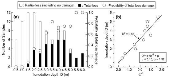 Here, PD is the probability of total-loss damage, and x is the external force index, which we selected as tsunami inundation depth, t as variable of integration. μ and σ are the average and standard deviation of x. μ corresponds to the inundation depth for 50% damage probability. The method of determining the statistical variables as μ and σ followed conventional method [9]. An example of a process for determining the variables as μ and σ on fragility function for fishery warehouse was shown in Figure 3. We made a histogram for the number of the repairable class including no damage and total loss class of fishery warehouse, as shown in Figure 3a. The class of the inundation depth was made to be the 0.5 m interval, and the repairable including no damage and total loss within the range were counted. Though there is a scattering in the sample number in each inundation depth class, it is proven that the total loss number increases as the inundation depth increases and that the total loss number becomes over the half when the inundation depth exceeds 3 m. The relationship between the probability of total loss damage and the median value of inundation depth based on sample data was also shown in Figure 3a. The statistical variables as μ and σ were evaluated regressively on normal probability paper. An example of the plot on normal probability paper rerated Φ-1 and inundation depth was shown in Figure 3b. The slope and intercept of the regression line were 3.17 and 1.32, respectively, corresponding to the statistical variables as μ and σ. In this case, the coefficient of determination R2 due to the least-squares fitting as 0.85.