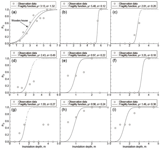 The inundation depth at which repair of warehouse facilities becomes necessary is 0.5 m, and the total-loss probability for an inundation depth of 2 m is about 20% (Figure 4a). The total-loss probability for an inundation depth of about 3 m is 50%. The major damage fragility function for wooden houses located along straight coasts for the 2011 Tohoku earthquake [13] (dot-dash line in Figure 4a) is similar to that for warehouses.