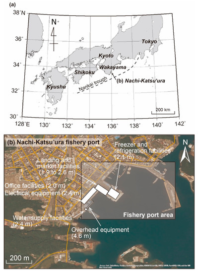 Location (a) and elevations (b) of fishery facilities and equipment for the Nachi-Katsu’ura Fishery Port of Wakayama Prefecture. The spatial distribution of fishery facilities and equipment in (b) is shown with respect to ground height. Numerals in parentheses indicate the ground height relative to mean sea level in Tokyo Bay.