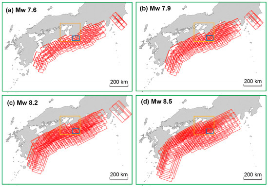 A tsunami source fault model with 1506 types of tsunami scenarios. The solid green line region indicates spatial grid of 810 m, orange line region as 270 m, blue line region as 90 m, (a) Earthquake moment magnitude cases of Mw 7.6, (b) Mw 7.9, (c) Mw 8.2, and (d) Mw 8.5.