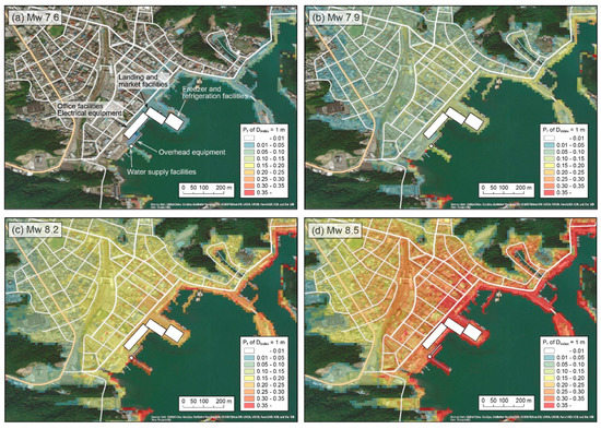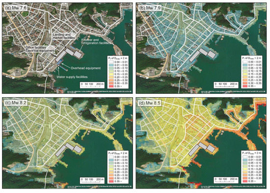 Pr for inundation depths exceeding 2 m around the Nachi-Katsu’ura Fishery Port was shown in Figure 8, A slight inundation only occurs near the quay, Pr at Nachi Katsu’ura Fishery Port is less than 5% for Mw 7.6 class in Figure 8a. for over Mw 7.9 class of tsunami scenario, Pr distribution area has widely spread not only in Katsu’ura Fishery Port but also in inland areas in Figure 8b–d. Pr as 0.02 to 0.08 were distributed around the facilities in the Mw 7.9 class. Pr as 0.08 around the water supply facilities, as 0.05 around the landing and market, as 0.03 around the office and as 0.02 around the freezer and refrigeration. In the Mw 8.2 class, Pr as 0.10 to 0.17 were distributed around the facilities, Pr as 0.17 around the water supply, as 0.15 around the landing and market, as 0.10 around the office and as 0.12 around the freezer and refrigeration. In the Mw 8.5 class, Pr as 0.16 to 0.28 were distributed around the facilities, Pr as 0.28 around the water supply, as 0.21 around the landing and market, as 0.16 around the office and as 0.17 around the freezer and refrigeration. Thus, as the class of Mw increases, Pr around each facility also tends to increase.