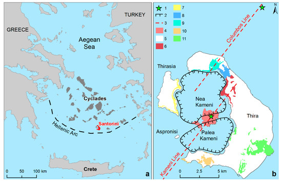 (a) Location of Cyclades Islands and Santorini (Greece). (b) Geodynamic and volcanological setting (modified after [19]) keys: (1) Active volcanoes; (2) Caldera boundary; (3) Tectonic lines; (4) Kameni Island volcanoes (197 B.C.–1950 A.D.); (5) Minoan tuff formation; (6) Skaros volcanic complex; (7) Thirasia volcanic complex; (8) Peristeria volcanic complex; (9) Megalo Vouno volcanic complex; (10) Akrotiri volcanic complex; (11) Pre-volcanic bedrock (Trias–Eocene).