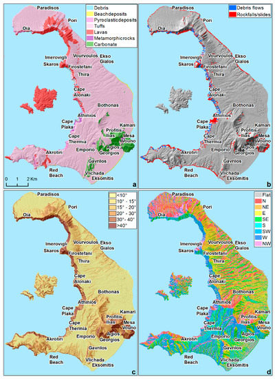- Antoniou, V.; Lappas, S.; Leoussis, C.; Nomikou, P. Landslide Risk Assessment of the Santorini Volcanic Group. In Proceedings of the 3rd International Conference on Geographical Information Systems Theory, Applications and Management (GISTAM 2017), Porto, Portugal, 27–28 April 2017; pp. 131–141. [Google Scholar]