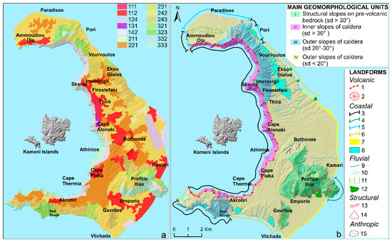 (a) Corine Land Cover (2018); the legend codes are reported in Table 2. (b) Geomorphological map of Thira Island: (1) Caldera rim; (2) Volcanic cone; (3) High cliff on hard/soft interbedded pyroclastic rocks; (4) High cliff on limestone bedrock; (5) Low cliff (<10 m) on soft pyroclastic rocks close to a beach; (6) Low cliff (>10 m) on soft pyroclastic rocks close to a beach; (7) Flat coast (beach); (8) Marine terrace; (9) Down-cutting gully; (10) Main stream; (11) Footslope area; (12) Alluvial fan and fan deltas; (13) Structural slope; (14) Triangular facet; (15) Quarry.
