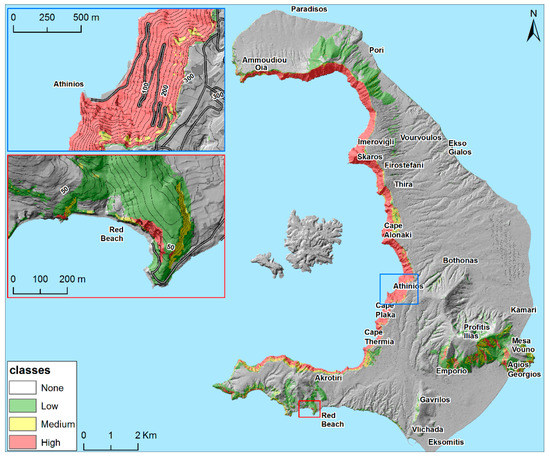 The map in Figure 5 shows a low susceptibility for the southeastern sector (MGU I), as no debris flow was identified, and few areas are characterized by high susceptibility due to rockfalls, as the carbonates are fractured and affected by faults. The inner rim (MGU II) in the western area is mainly characterized by high susceptibility. It is made of a complex interbedding of volcanic sequences, with considerable strength contrasts between soft and hard rocks, which result in a step-like morphology due to morphoselection. Furthermore, the slopes are also very steep, and evidence of past landslide events can be observed. In this unit, several strategic infrastructures and tourist points are located, i.e., Oia docks, Thira and Athinios harbors, Oia and Akrotiri desalination plants, and some pocket beaches. The outer slopes (MGU III) are made of lavas that are characterized by a variable degree of fracturing and slope angles. In the northern area, low susceptibility prevails; by contrast, in the southern area, all the classes are represented, the low is dominant, while the high susceptibility is found for the famous Red Beach, which is highly frequented by tourists in summer. Conversely, low or no susceptibility is found where gradients are low on watersheds and flat areas, due to the outcrop of Minoan tuff, which constitutes the MGU IV.